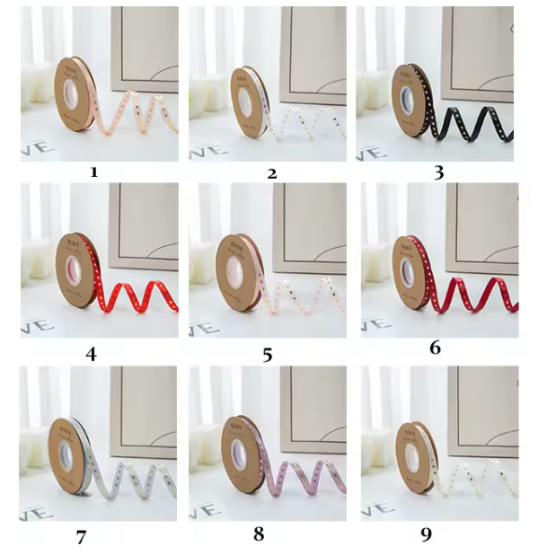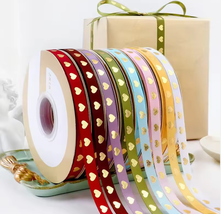 Feature Highlights: This 1 cm * 40 size polyester ribbon is perfect for flower packaging and decoration, featuring 9 colors of hot pressed heart-shaped design. Supports multiple printing methods, including heat transfer printing, digital printing, and screen printing, to meet different customization needs. This ribbon is environmentally friendly and an ideal choice for Valentine’s Day or floral themed occasions.
