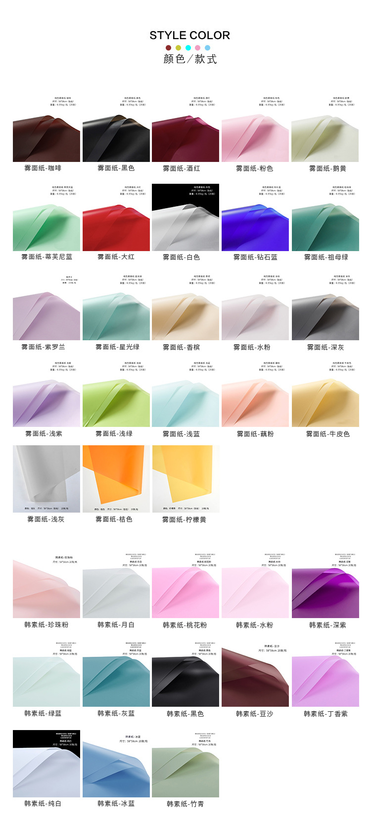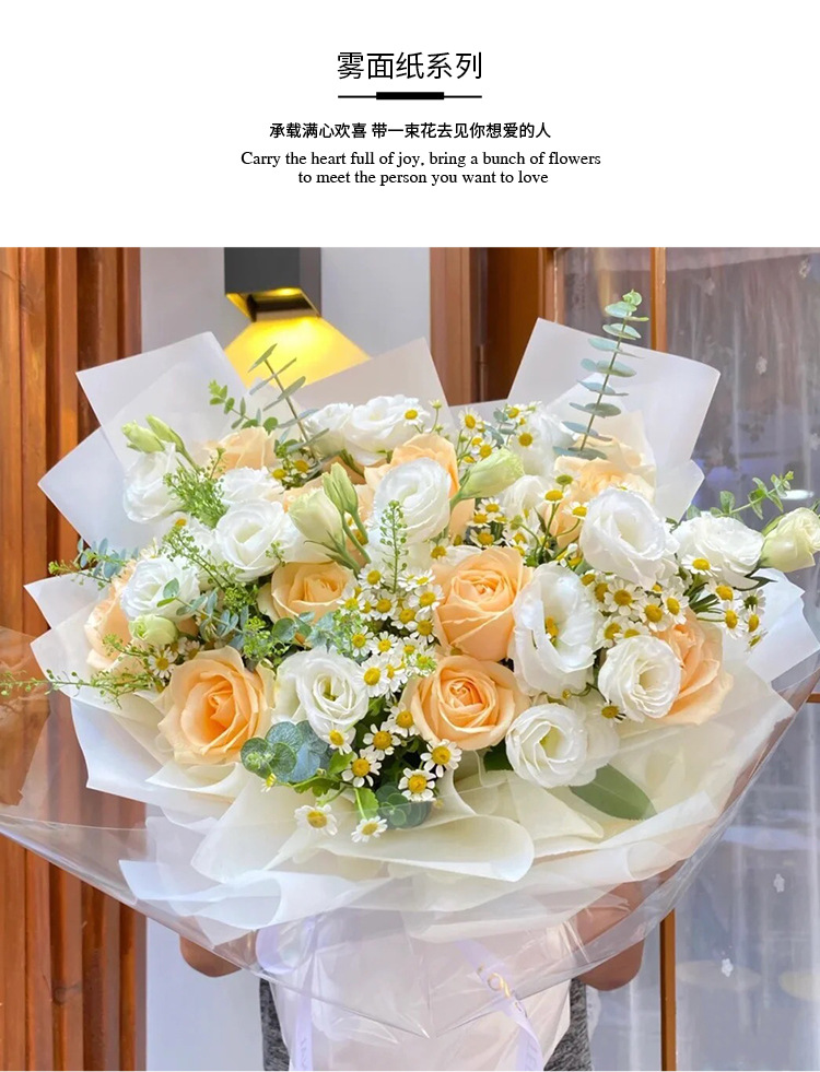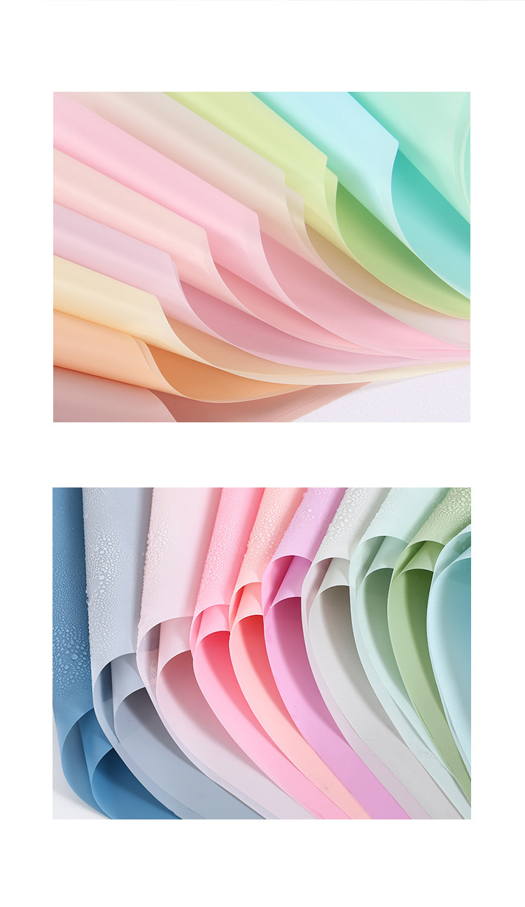 Feature Highlights: This pack of 20 semi transparent waterproof flower bouquet wrapping papers is made of high-quality synthetic paper, with durability and solid color design. Suitable for Korean style flower packaging, supports customized orders, including logo printing and small batch purchases. Each piece measures 58 * 58 centimeters, making it suitable for various floral arrangements and industrial applications such as gravure printing.